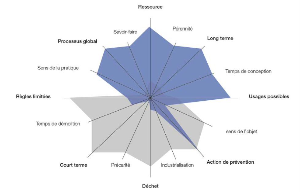 Dans ce concept, l’action de réemploi en elle-même n’est pas une question centrale. Ce qui est important c’est de s’inscrire dans un cadre plus global à l’intérieur duquel on va apprendre à raisonner le réemploi au cas par cas, en établissant des scénarios en fonction du projet et de ses spécificités. Avec ce nouveau paradigme, pour les produits, matières et matériaux concernés, l’idée est de passer du statut de « déchet », induit par la réglementation, à celui de « ressource », du concept de « réemploi » à celui de « réusage ».