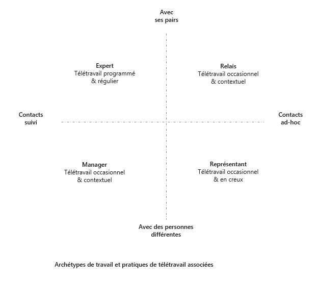 Des modes de télétravail sont aussi associables à chaque archétype. Le spécialiste fera plutôt des journées continues de télétravail, régulières et programmées. Le relais préférera venir au bureau et fera du télétravail de façon occasionnelle, en fonction de contraintes personnelles ou pour réaliser des tâches précises et momentanées. Le manager sera soucieux de maintenir le lien, il aura tendance à travailler au bureau et télétravaillera en fonction des autres ou, comme le relais, pour répondre à des besoins particuliers. Enfin, le représentant se servira du télétravail pour optimiser son emploi du temps : il pourra donc travailler chez lui, mais aussi dans des espaces de coworking ou d’autres sites de l’entreprise situés près de chez lui.