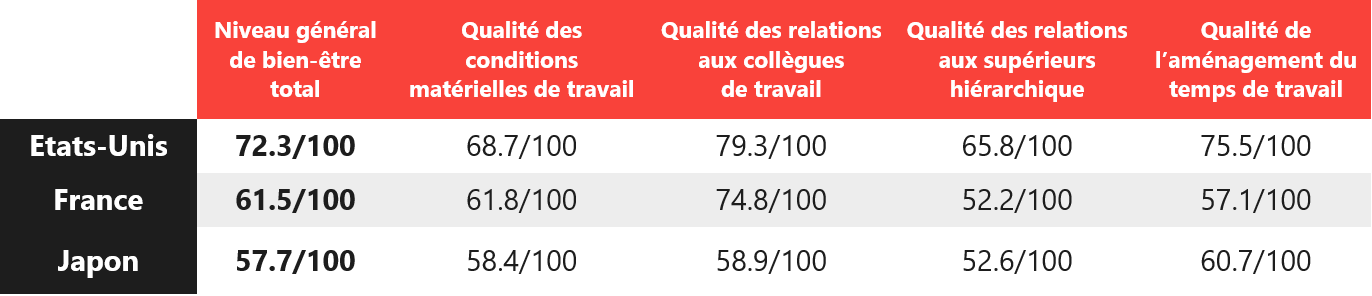 Ce score général correspond au cumul de quatre aspects fondamentaux du travail : la qualité des conditions matérielles de travail, celles des relations aux collègues de travail et au manager et, enfin, la qualité de l’aménagement du temps de travail (volume et stabilité des horaires, équilibre vie privée – vie professionnelle). Les Américains ne sont dépassés sur aucun de ces aspects. Les Français luttent pour ne pas être distancés en matière de conditions de travail et de relations entre collègues, sans grand succès il est vrai. Malgré les 35 heures, les scores exprimés au sujet du temps de travail les placent derrière les japonais (57,1) ! Loin devant, les Américains semblent tout à fait heureux dans ce domaine (75,5). La règlementation, quand elle existe, y est pourtant beaucoup plus lâche. Effectuer 50 heures hebdomadaires ne relève pas de l’exploit légendaire tandis que la récupération estivale excède rarement les deux semaines. Il reste à savoir si les Français sont frustrés par les contrôles de la DIRECCTE qui les empêchent de travailler davantage ou s’ils ramènent trop de travail à la maison…