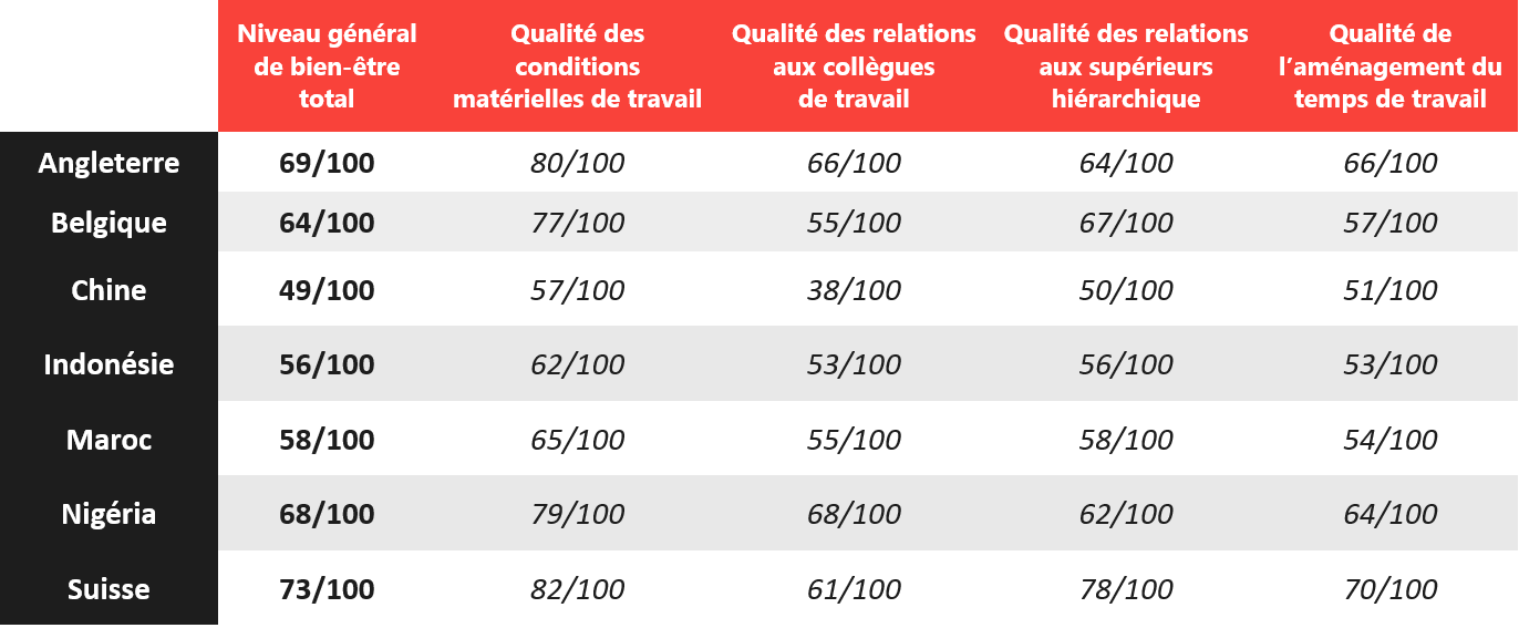 Dans la continuité de ces premiers travaux, cette enquête internationale sur la mesure du bien-être au travail se poursuit. De nouvelles données sont en cours d’acquisition. Si elles sont encore trop peu nombreuses pour être analysées et pour pouvoir en tirer des conclusions, les premiers résultats bruts issus de nouveaux pays peuvent au moins être présentés.