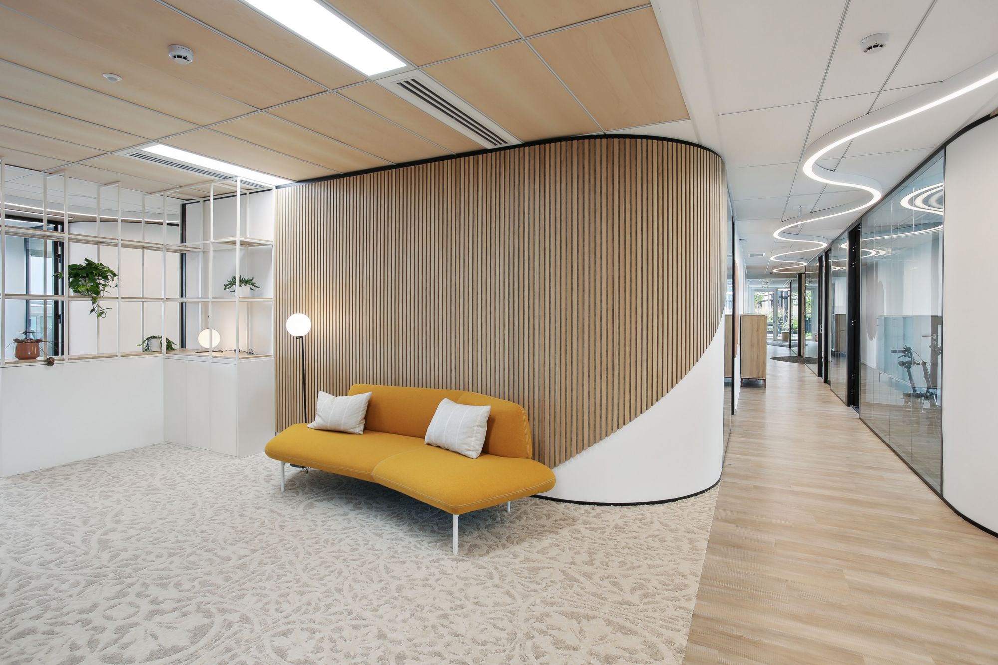 • Les courbes permettent de casser l’effet ligne droite, par le luminaire, les cloisons courbées, le calepinage des moquettes, les effets de peintures et les alcôves menuisées