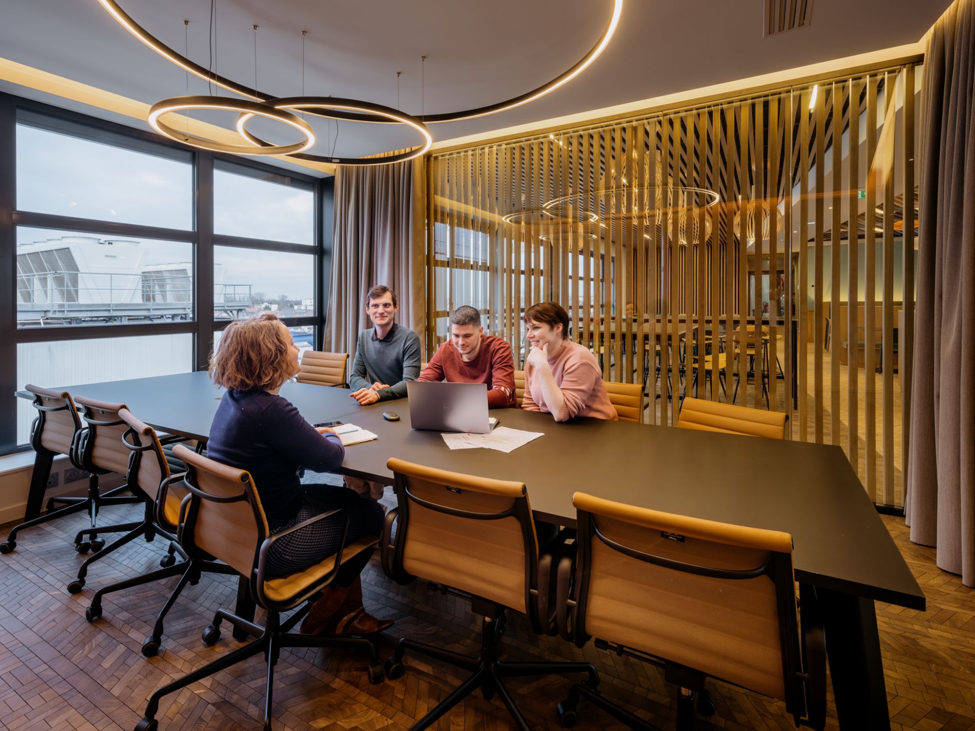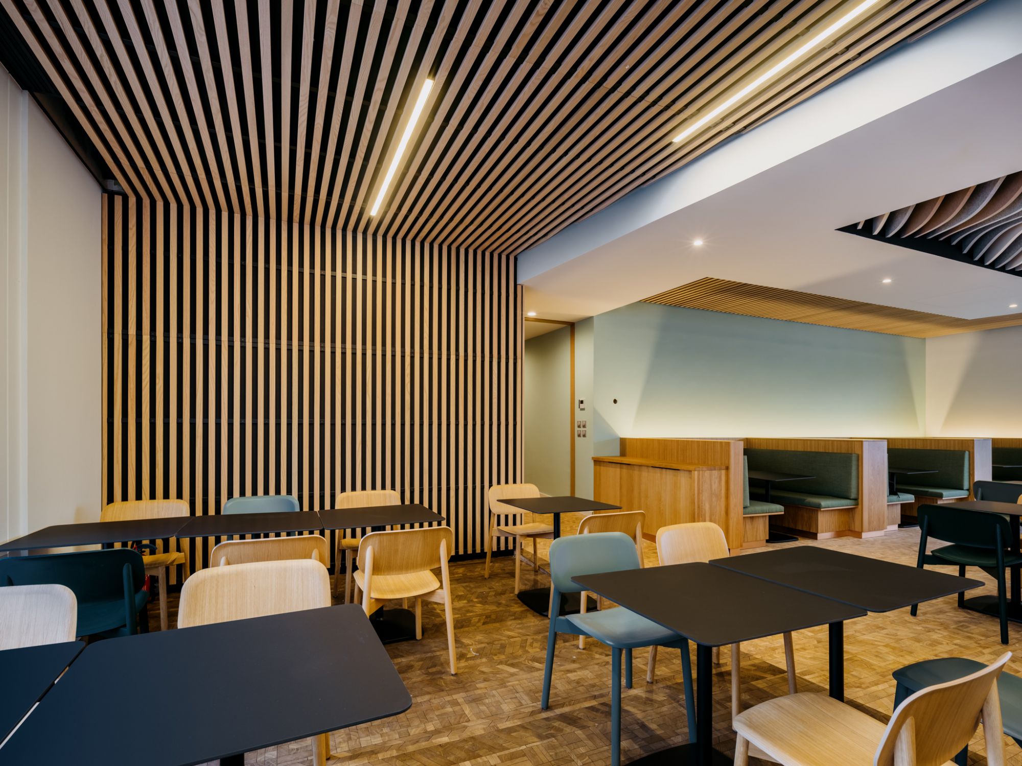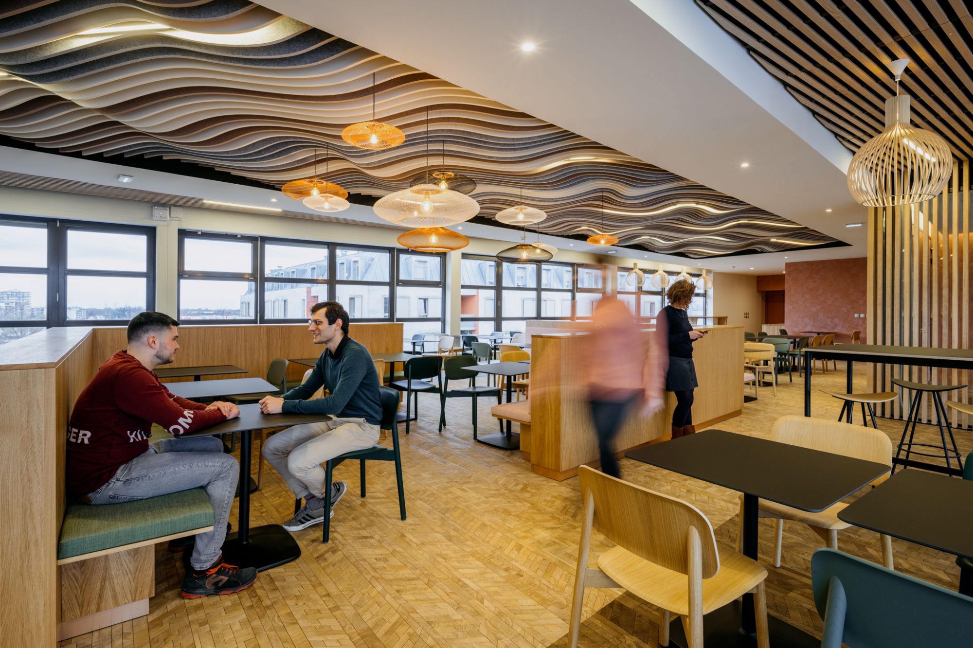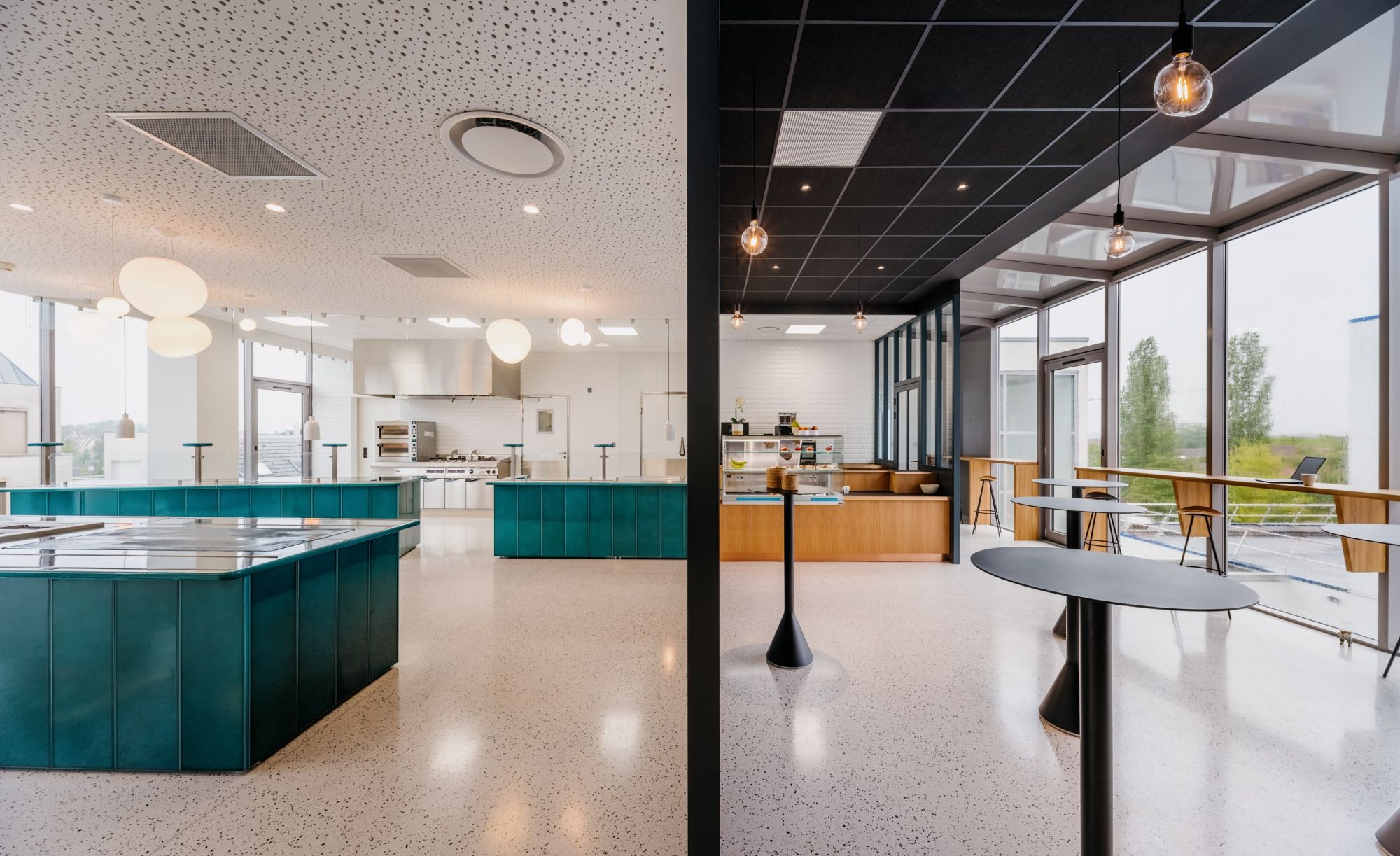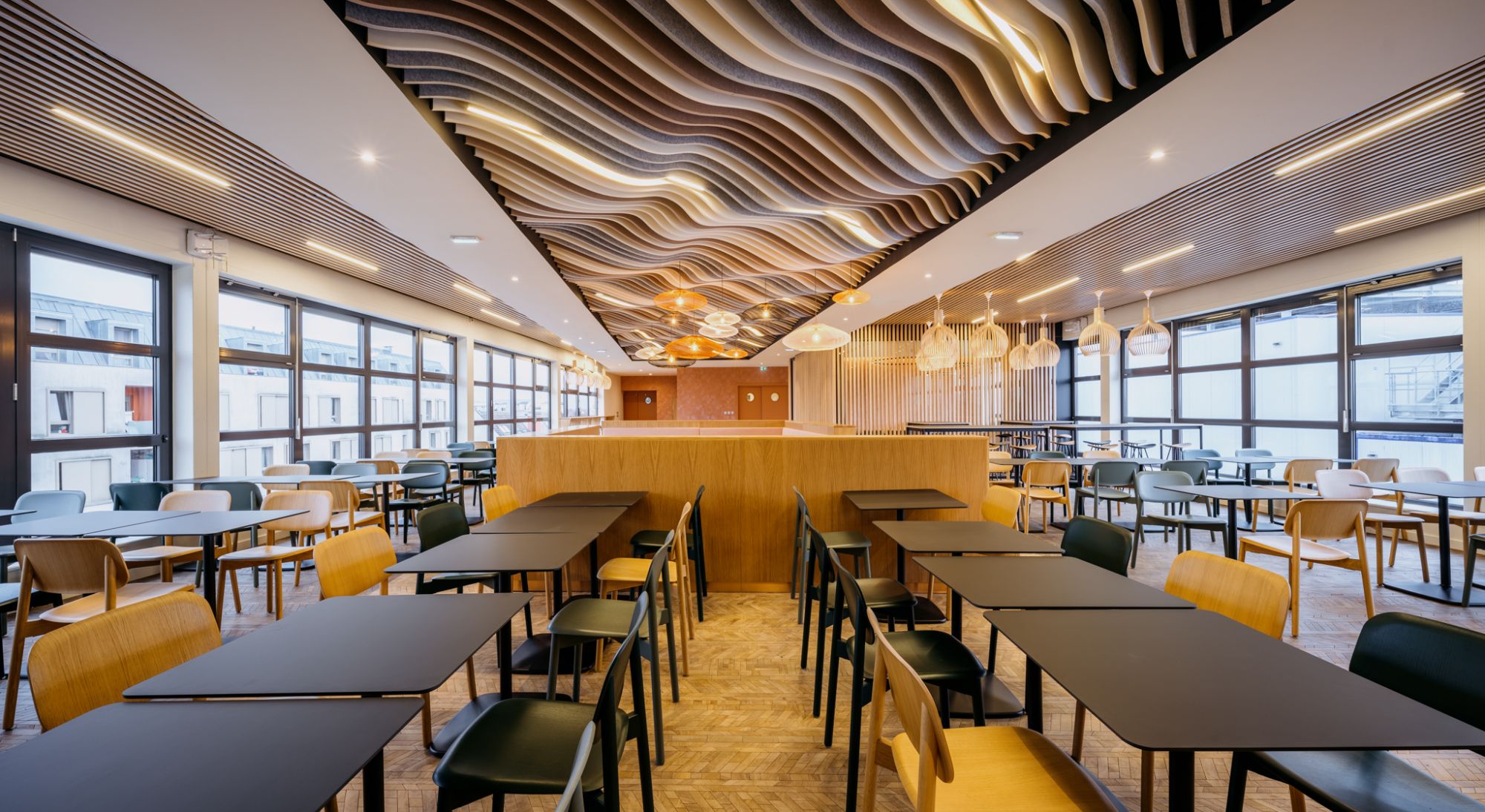 Un travail sur la flexibilité des espaces et la pluralité des usages a été mené par nos équipes, pour assurer une activité de restaurant, de cafétéria et également de co-working.