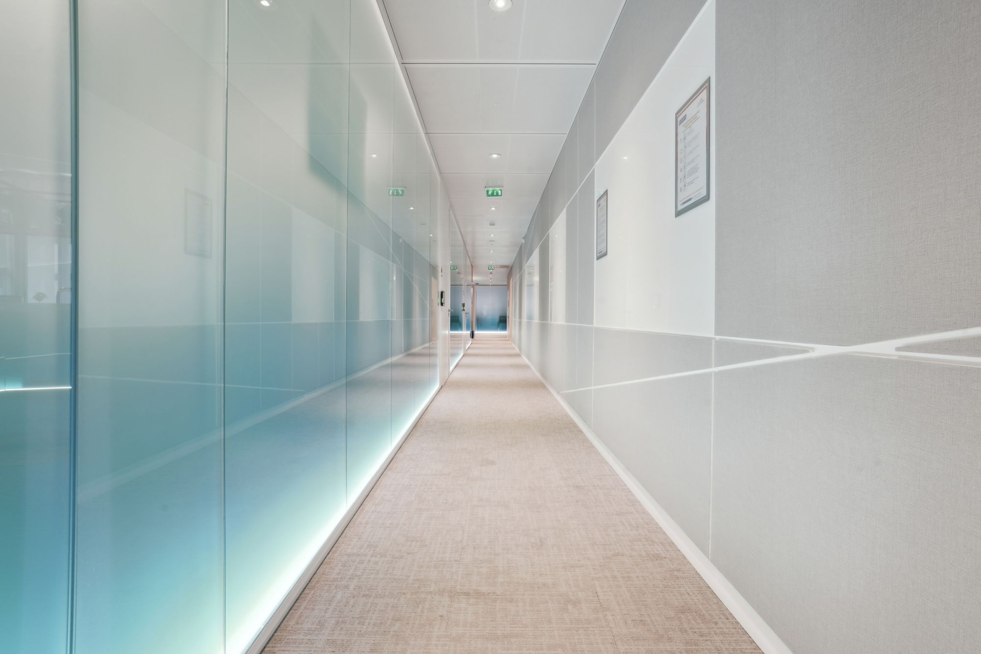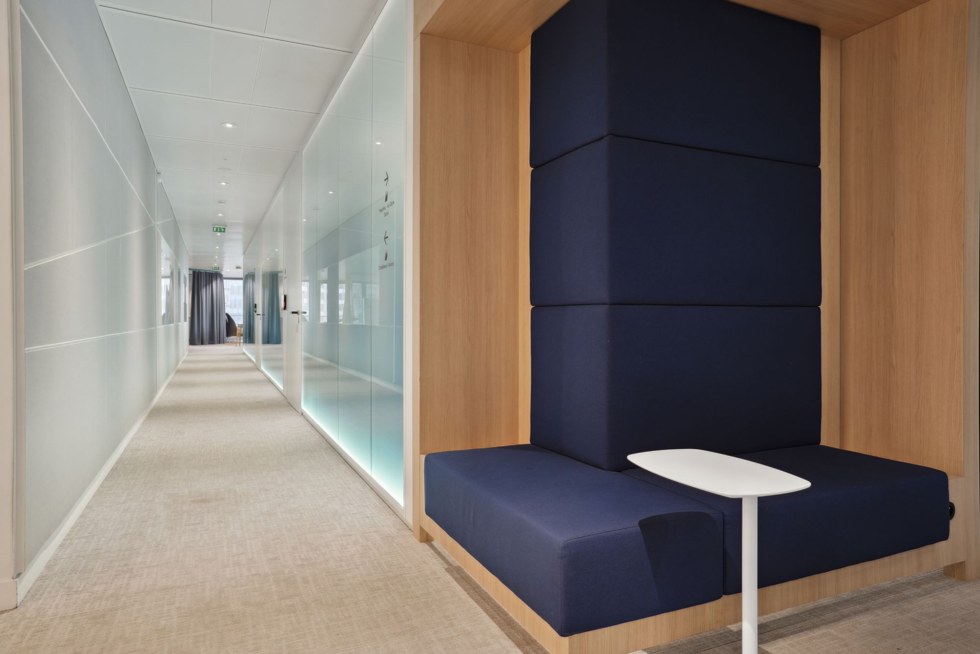 Des bandeaux lumineux ont été intégrés dans les cloisons pour théâtraliser les circulations et mettre en valeur les vitrages Saint-Gobain