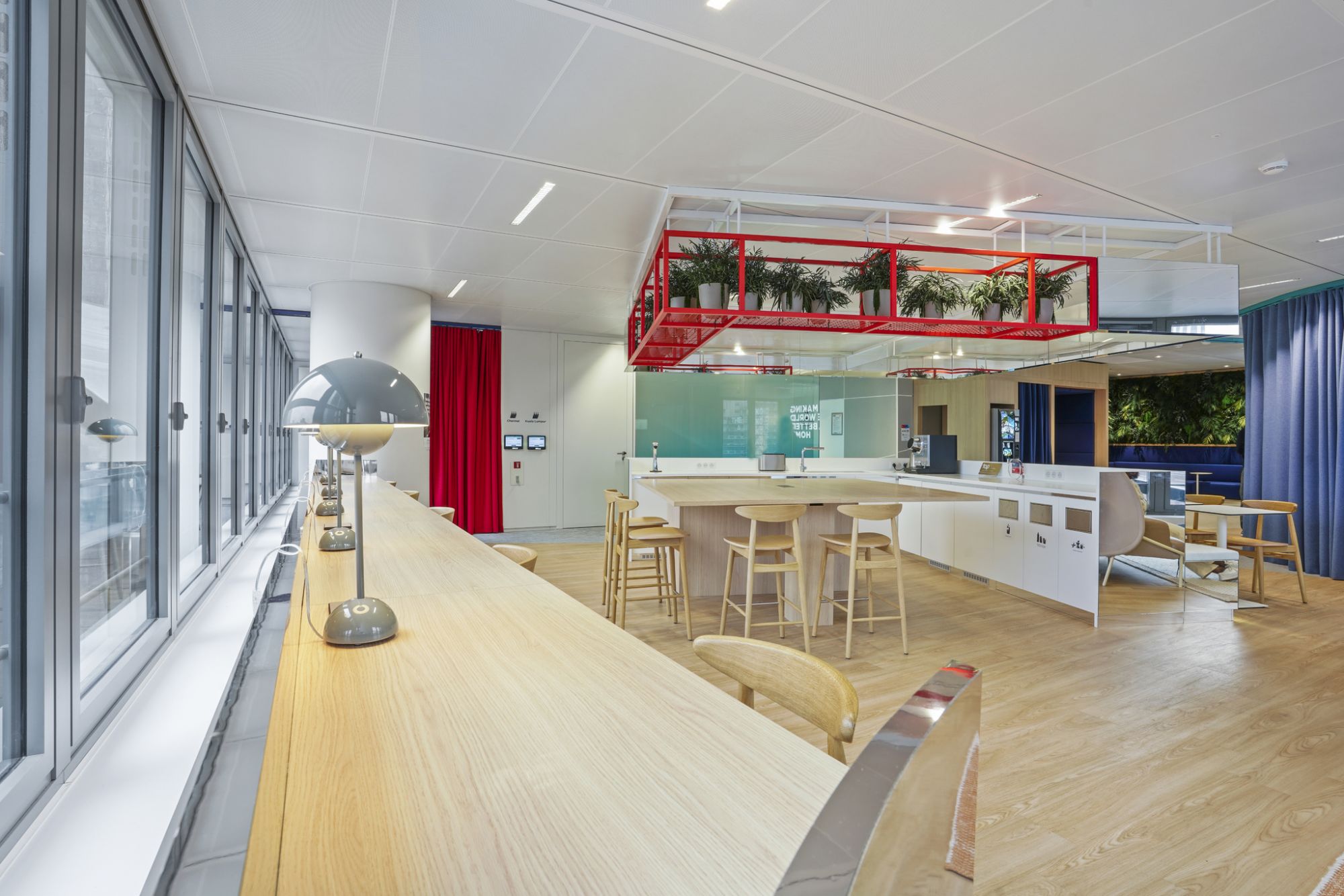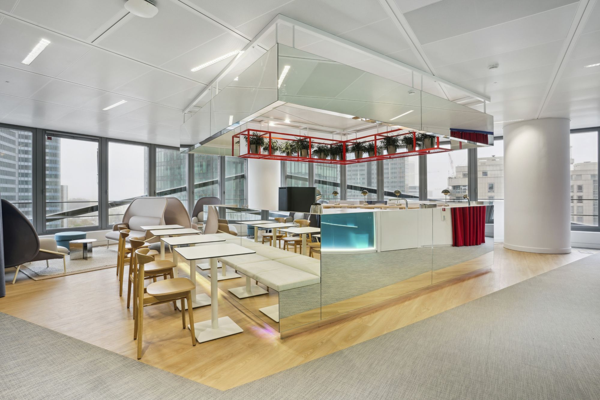 L'ilôt du Work Café en miroirs, trait d'union entre le Work lounge et les espaces de réunion