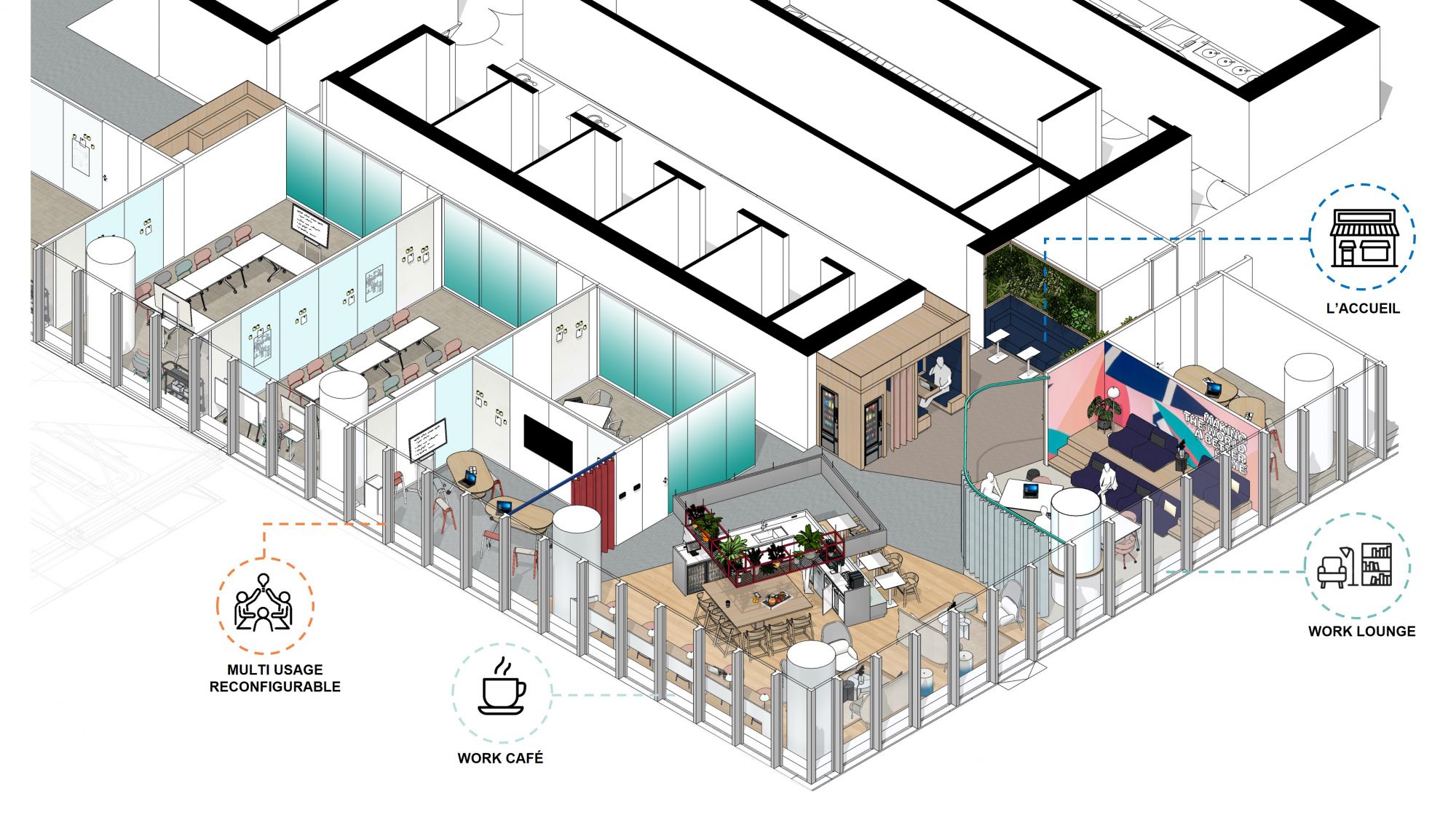 L’objectif de la mission était de concevoir une plateforme qui corresponde aux nouveaux modes de travail des équipes du groupe : plus agile, reconfigurable et adaptée aux usages de demain tout en redensifiant l’offre de place en salle de réunion pour répondre à l’évolution des besoins.